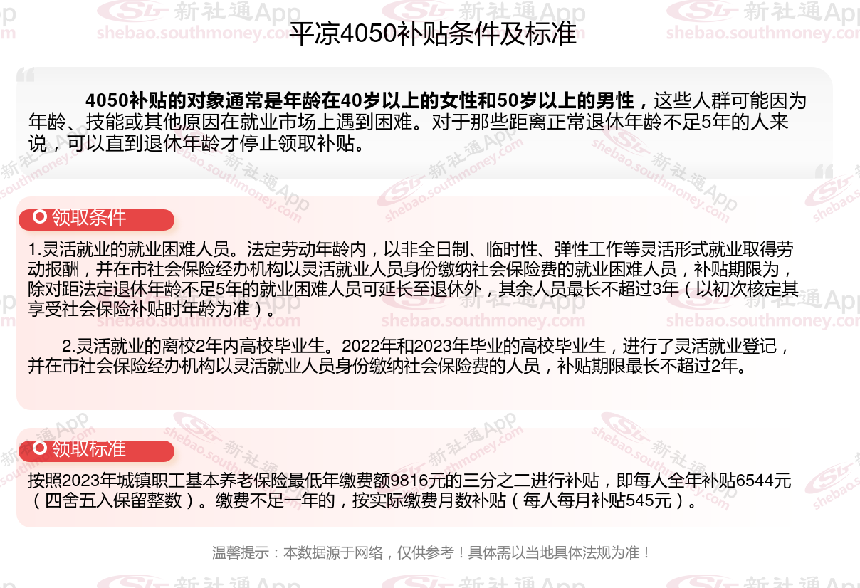 2024平凉4050补贴主要针对的是年龄在40岁以上的女性和50岁以上的男性,这些人群通常因为年龄较大而面临就业困难。