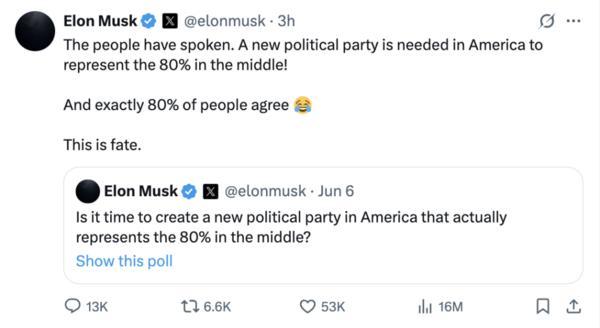 对此,马斯克写道“公众已经发声。美国需要一个全新的政党,来代表80%的中 产阶级!刚好有80%的人表示同意。”随后他又补充说“美国党(The America Party”。
