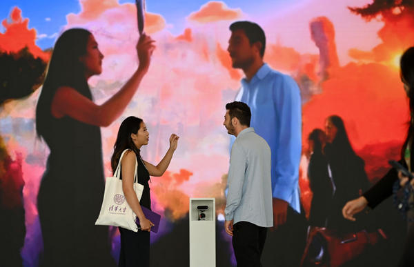 6月25日,嘉宾在第十六届夏季达沃斯论坛文化之夜上和人形机器人互动。新华社记者 李然 摄