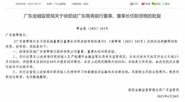 财经6月30日讯 近日,**金融监督管理总局广东监管局公布一则批复显示,核准徐茹斌广东南粤银行股份有限公司董事、董事长的任职**。