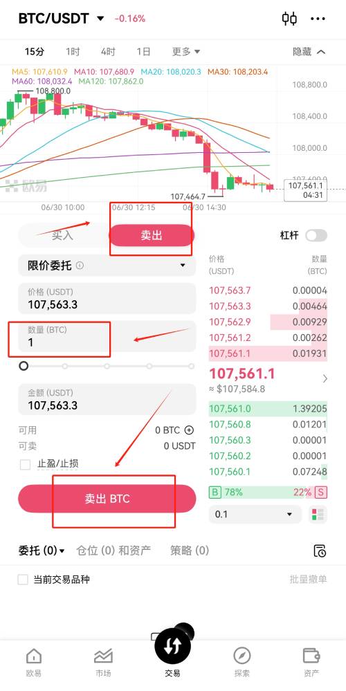 2.输入想要卖出BTC数量,点击卖出BTC就可以置换成USDT