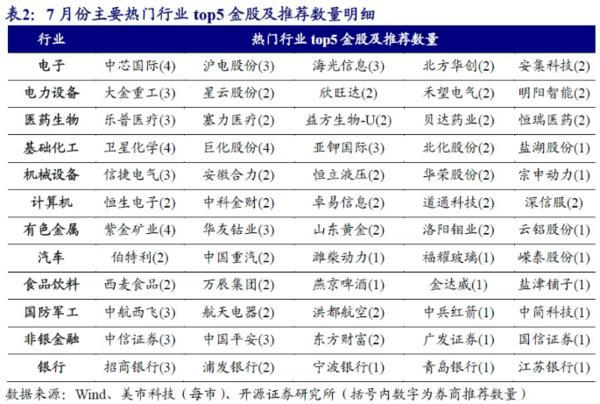 开源证券数据显示,相较6月份,7月券商金股增加最多的行业分别为电力设备、电子、计算机,增幅分别为4.1%、3.8%和1.9%。