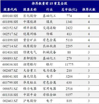 基础化工板块卫星化学、巨化股份并列**,合计均被推荐了4次;机械设备板块为信捷电气,合计被推荐了3次;计算机板块恒生电子、中科金财、卓易信息、道通科技、深信服等居前,合计均被推荐了2次;有色金属板块紫金矿业被推荐次数最多,合计被推荐了4次。