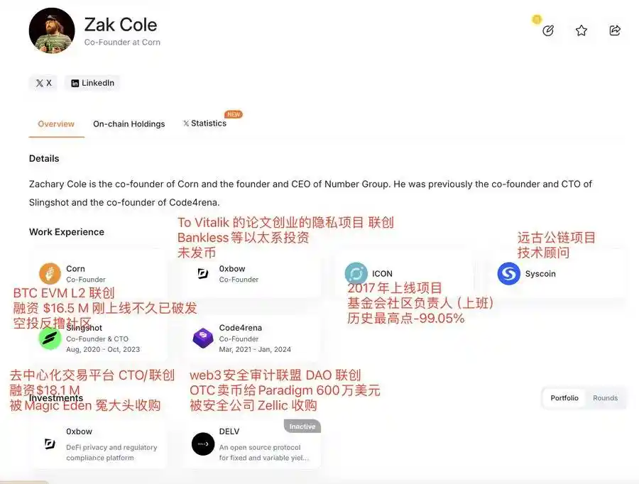 社区,往往是受伤害的接盘侠。据 X 上知名爆料博主加密无畏透露,Zak 参与的几个比较大的项目,市场表现都不太理想。比如 BTC L2 Corn,上线不久就已破发,同时空投策略也反撸了社区一波;而 2017 年其参与的远古项目 ICON,**几乎归零。