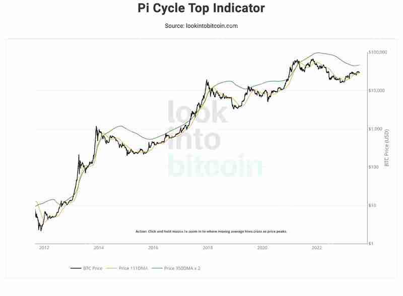 Pi 周期顶部指标使用 111 天移动平均线(111DMA) 和 350 天移动平均线的倍数 (350DMAx2) 来预测比特币的顶部。