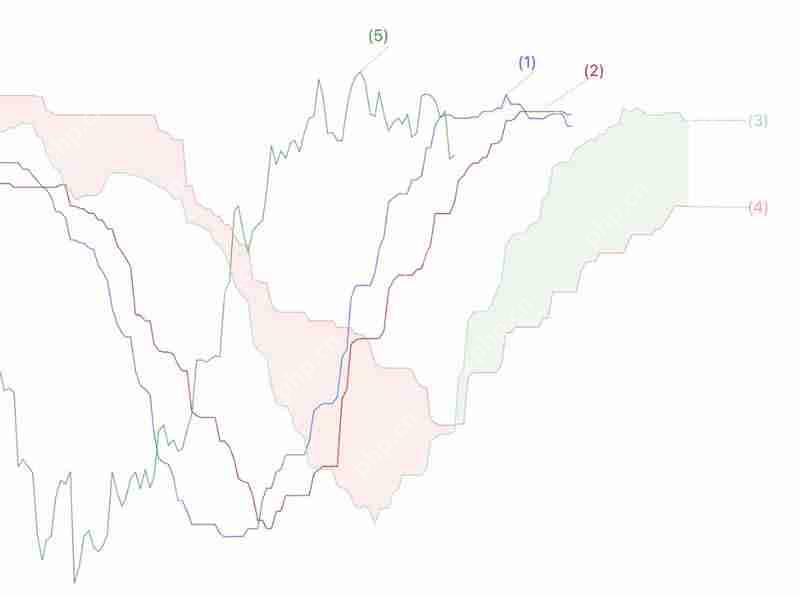 - (4)先行跨度 B 或 Senkou Span B:过去 52 条烛台的移动平均线,预测未来 26 个周期。