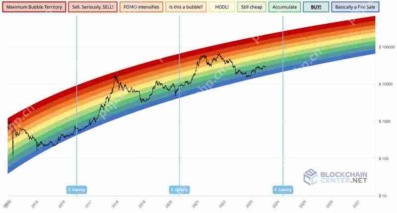 比特币彩虹图,顾名思义,是由简单的对数回归形成的彩虹状图表,描绘了比特币价格随时间的变化。该图表将比特币的历史价格叠加在彩色 图表上,并以带状线指示其可能接近顶部还是底部。