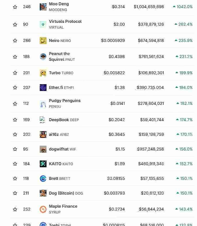 最近大饼停涨,山寨乱串,目前这轮的节奏就是大饼涨完,山寨开始发力,目前我大概看了下山寨特别是meme每次都是超过100%的涨幅。每一轮的meme都是涨幅**,比如17年的doge,21年的shib,24年的pepe,还有这轮的moodeng(目前已经10x),所以今天我们来看下谁能成为25年**大牛市的500亿美金meme之新王!