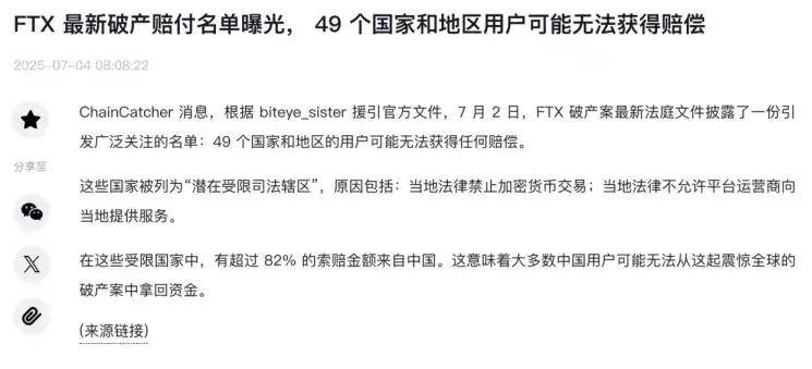 就在 2025 年 7 月 4 日,FTX 债权人代表 Sunil 发文确认:在即将启动的 FTX 赔付计划中,**用户可能因监管归属问题,被排除在主赔范围之外。消息一出,引发中文加密社群的广泛讨论和情绪波动。