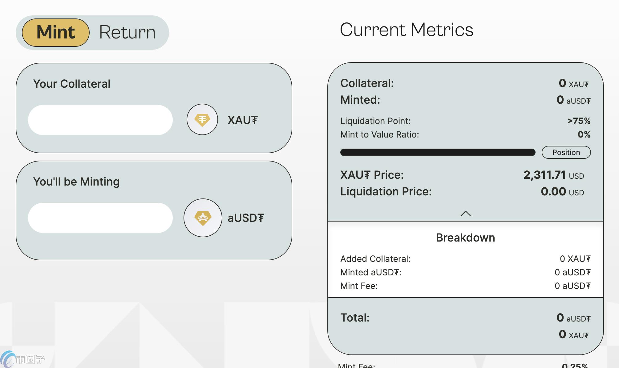 通过官方铸造网站,用户只需要存入XAUT就能铸造aUSDT,铸造费用0.25%。目前推出不到一天,aUSDT规模已到802万美元,由9个地址持有。约4962个XAUT被当作抵押品,占其流通量的0.02%。