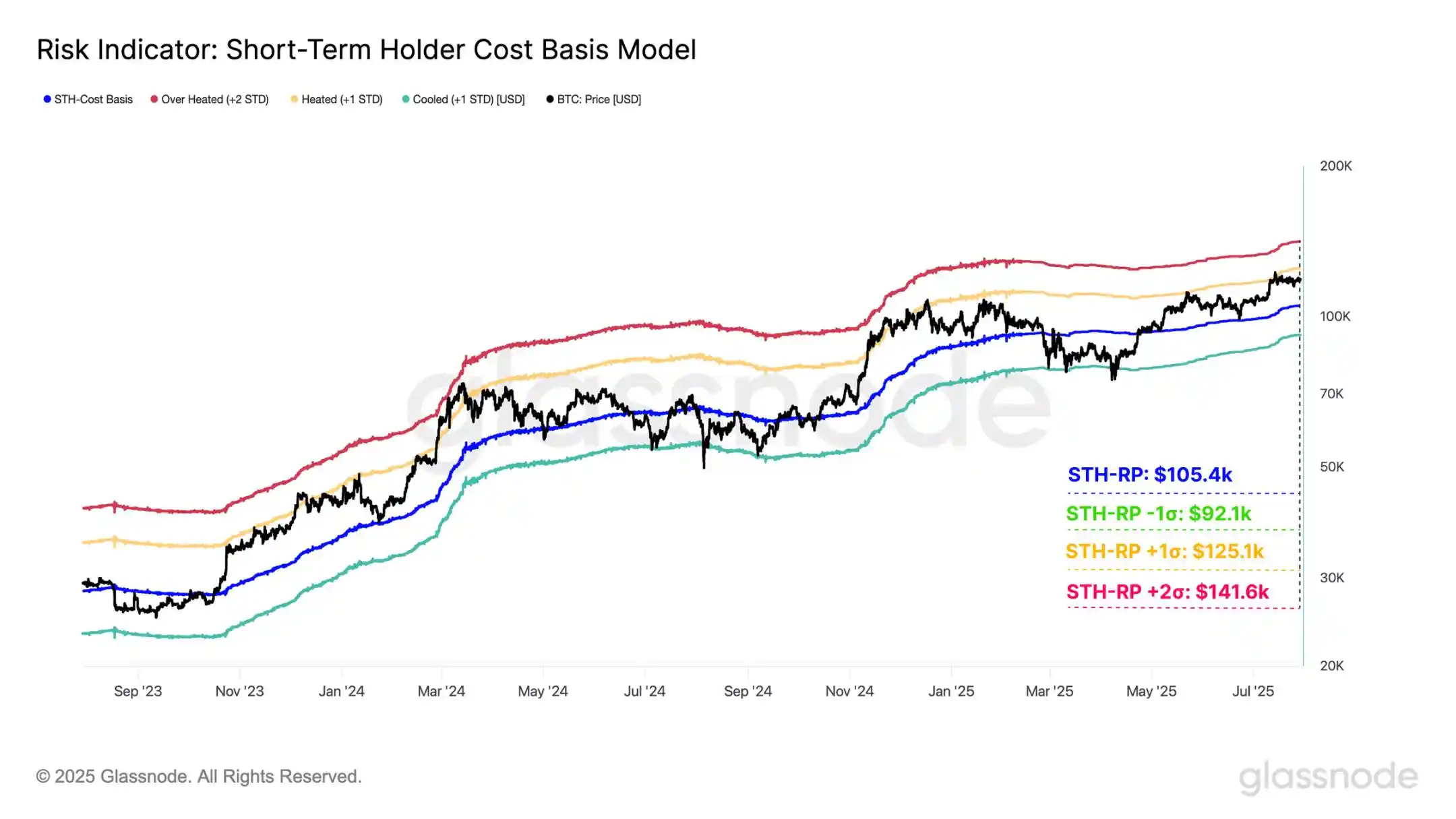 短期持有者成本基础(代表新进投资者的平均持仓成本)历来是划分局部牛熊市况的关键阈值。通过叠加标准差区间可增加统计维度: