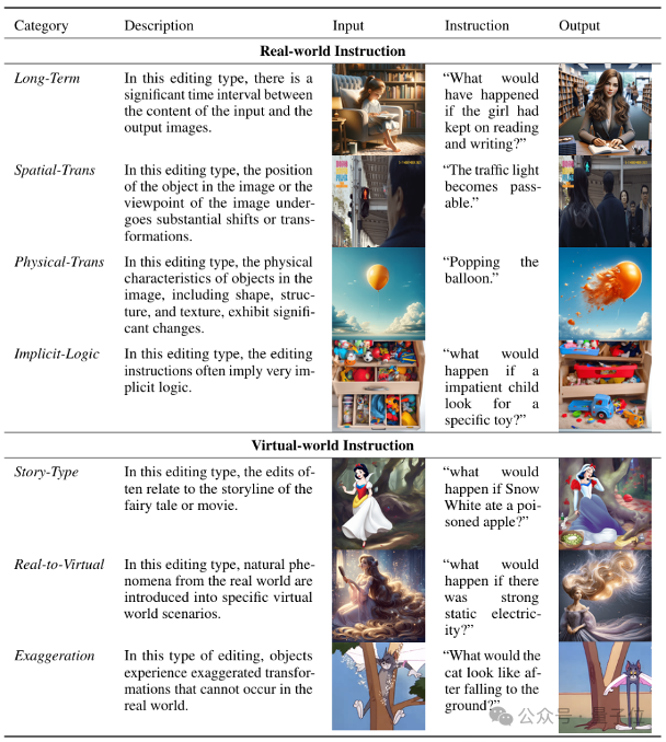 根据现实世界以及虚拟媒体中的任务场景,将world-instructed image editing分为7种认为类别,并对每一种类别进行了定义与介绍,同时提供了一个数据样例。