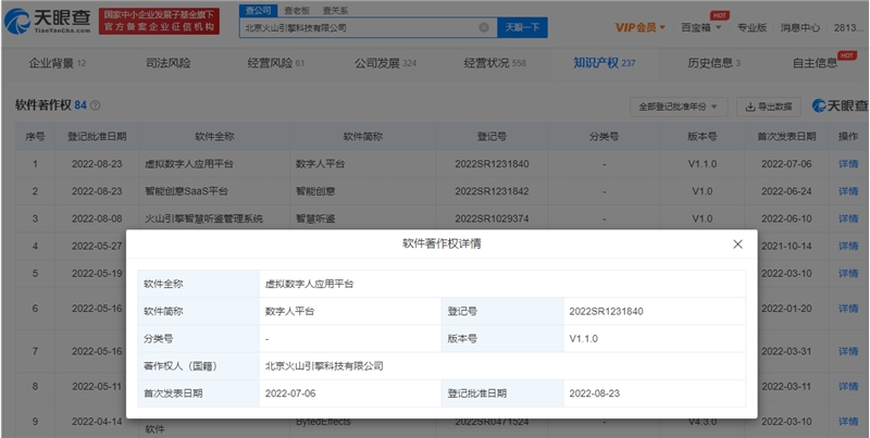 凤凰网科技讯9月2日消息,据天眼查App显示,近日,抖音旗下北京火山引擎科技有限公司“虚拟数字人应用平台”软件著作权获得登记批准,当前版本号为V1.0。