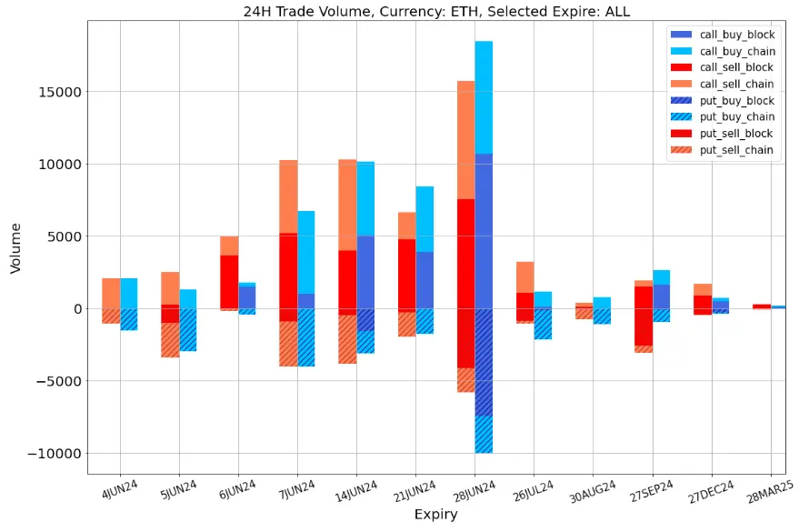 期权方面,昨日ETH Vol Surface**大幅走陡下降,可能一方面是相对BTC来说ETH近几天表现并不太好,价格**走低到了3800美元以下;另外期权前端上看涨期权的卖压也迫使IV和RR走低,市场的买涨需求主要仍落在六月底以后,期待以太坊现货ETF带来新的需求。