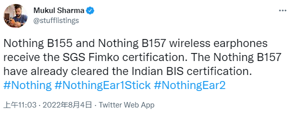 尽管新品的名称尚未得到确认,但 Mukul Sharma 推测它们会分别被称作 Nothing Ear(1)Stick —— 一如他之前所爆料 —— 以及 Nothing Ear(2)。