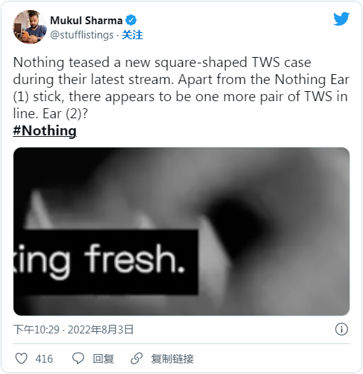在推出了旗下首款智能机 Nothing Phone(1)之后,该公司又被发现在期间“一晃而过”地展示了正在打造的 Nothing Ear(1)Stick 和 Nothing Ear(2)真无线耳机新品。其实早前,网络上已经盛传该公司正在推出一些新配件。但现在,知名爆料人 Mukul Sharma 又在 Twitter 上分享了更明确的信号。