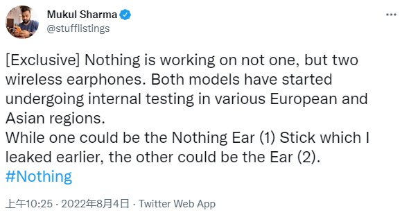 @stufflistings 在推文中写道:Nothing 不是正在打造一款、而是两款无线耳机新品,并已在欧亚各个地区展开内部测试。