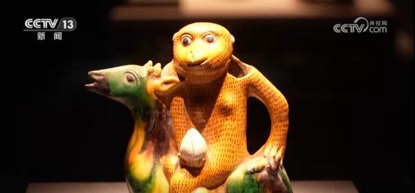 在这个展览当中,记者旁边的这一件素三彩的执壶是这个展览当中“显眼包”,可以看到一只憨态可掬的猴子手上还托了一颗桃,坐在了一匹马上,这件展品有一个非常好的寓意,它叫做马上封侯。