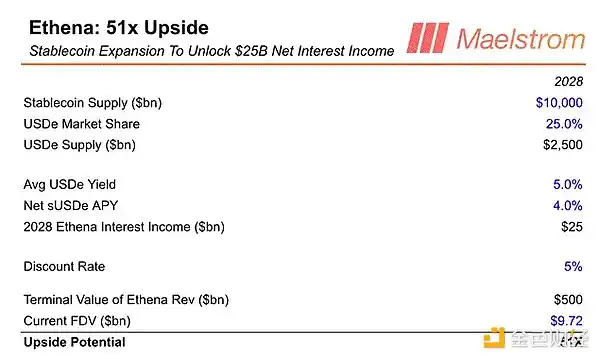 USDe 市场份额(USDe Market Share): 目前,Circle 的 USDC 占流通稳定币总量的 25% 市场份额。我相信 Ethena 将超越 Circle,并且随着时间的推移,我们看到在边际上,随着 USDe 获得存款,USDC 会流失存款。因此,我的长期假设是 USDe 获得 25% 的市场份额,紧随 Tether 的 USDT 之后。