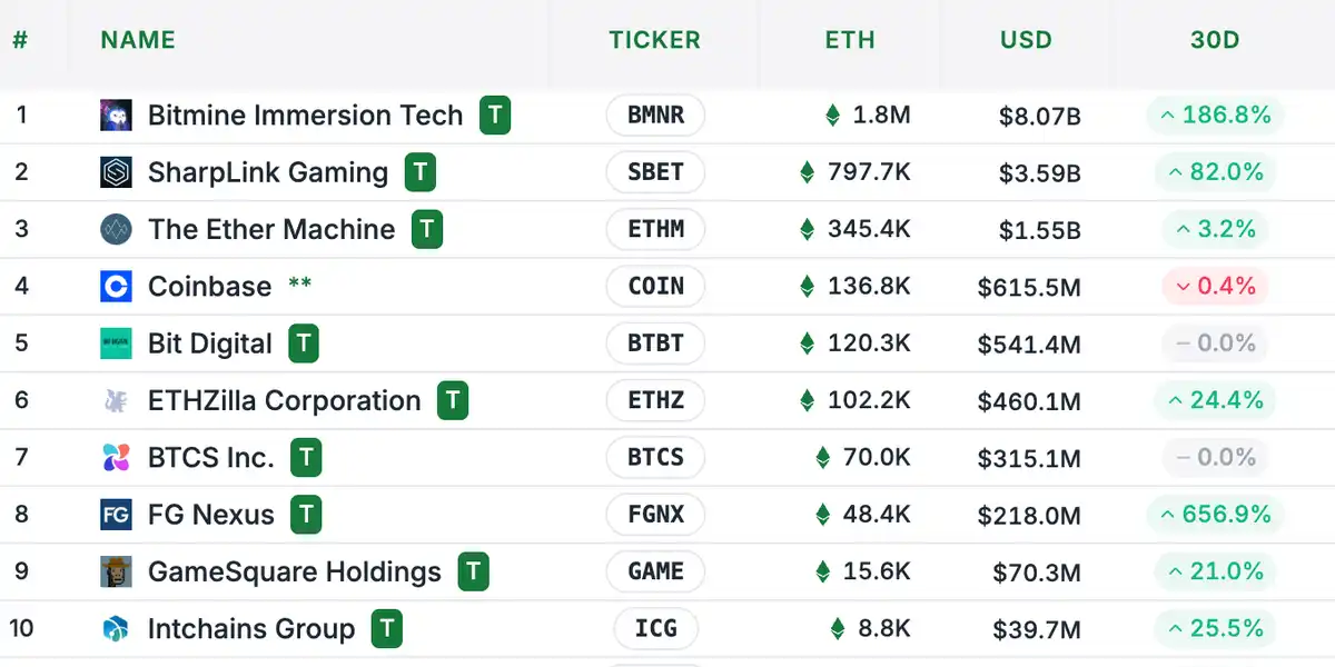 - The Ether Machine:34.5 万枚,30 日内变动 3.2% 其他如 ETHZilla、FG Nexus 等也在逐步加码。