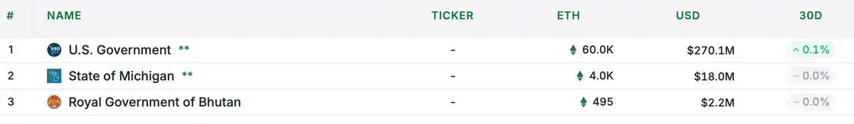 - 美国政府:约 60000 枚 ETH,价值约 2.7 亿美元