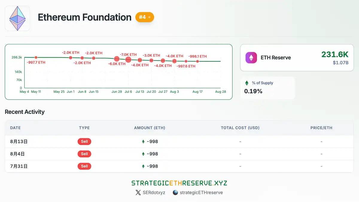 目前,以太坊基金会持有约 23.16 万枚 ETH,占总供给约 0.19%。虽然规模不算庞大,但这部分资金是长期战略性储备。基金会一般会定期抛售少量 ETH,用来支持研发、社区拨款与运营,基本属于「健康的卖压」。