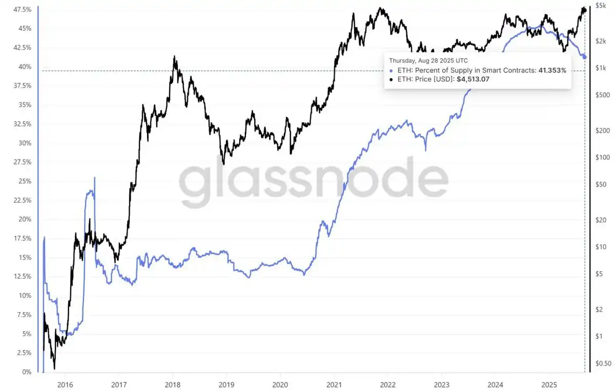 目前约 41.35% 的 ETH 已被锁定在质押、DeFi 等合约中,几乎占流通量的一半。其中约 1350 万 ETH(约占总供应的 11.25%)锁定在各类 DeFi 协议和跨链桥等智能合约中,反映出 ETH 正被广泛用于生态应用而非闲置。