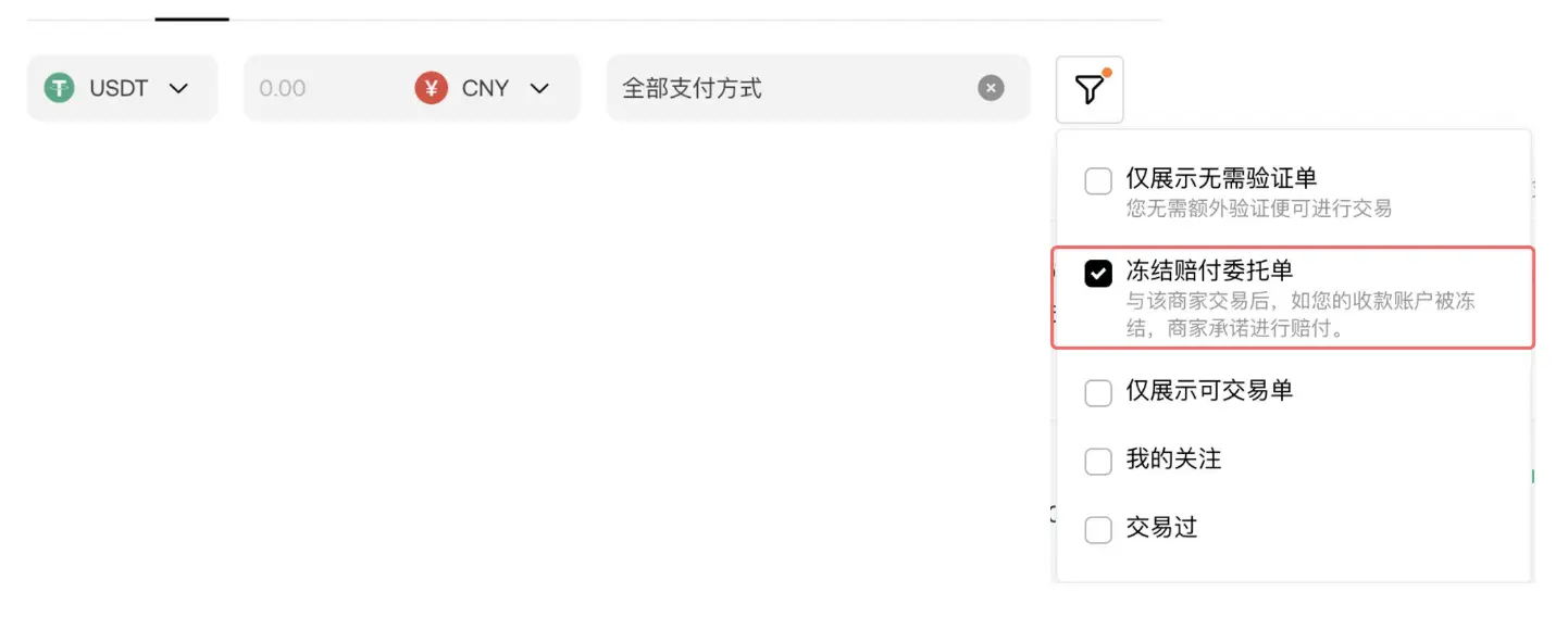 此外,为了方便用户选择,币安在C2C交易界面增加了专门筛选功能。用户也可以在筛选功能中,直接选择与“冻结赔付”商家进行交易,更快捷更安心。