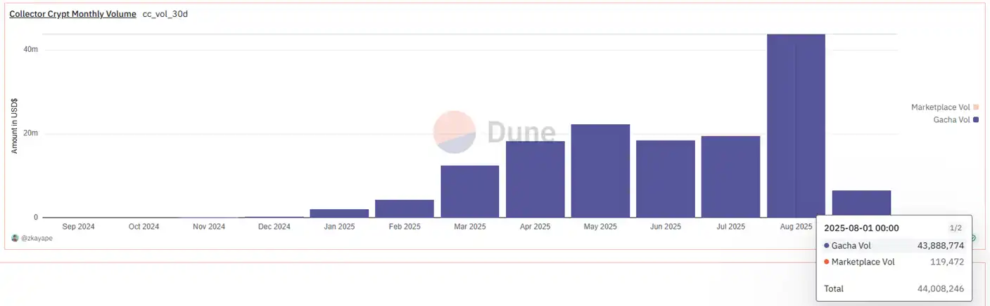 Collector Crypt 的这个**系统在今年 1 月份正式推出,当月就实现了约 200 万美元的销售额,3 月份时成长到了月度 1255 万美元,5 月份时成长到了月度 2231 万美元,上个月更是达到了 4389 万美元。而在上个月,Collector Crypt 卡片交易市场的成交额只有约 12 万美元。