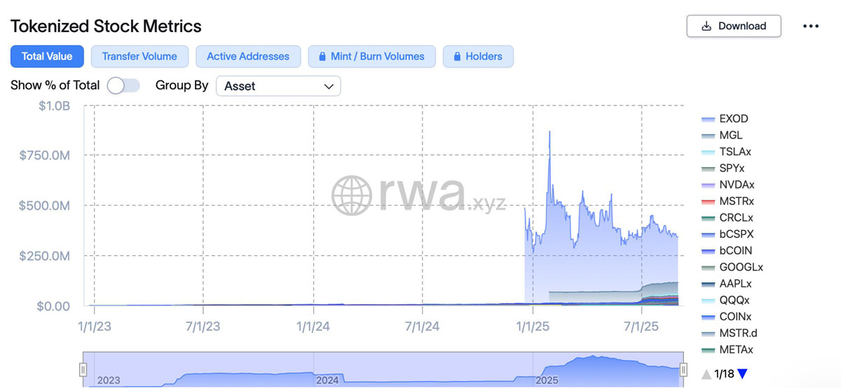 根据分析平台RWA.xyz,截至撰写本文时,**化股票市值为3.42亿美元,仅占整个279亿美元**化RWA市值的1.2%。