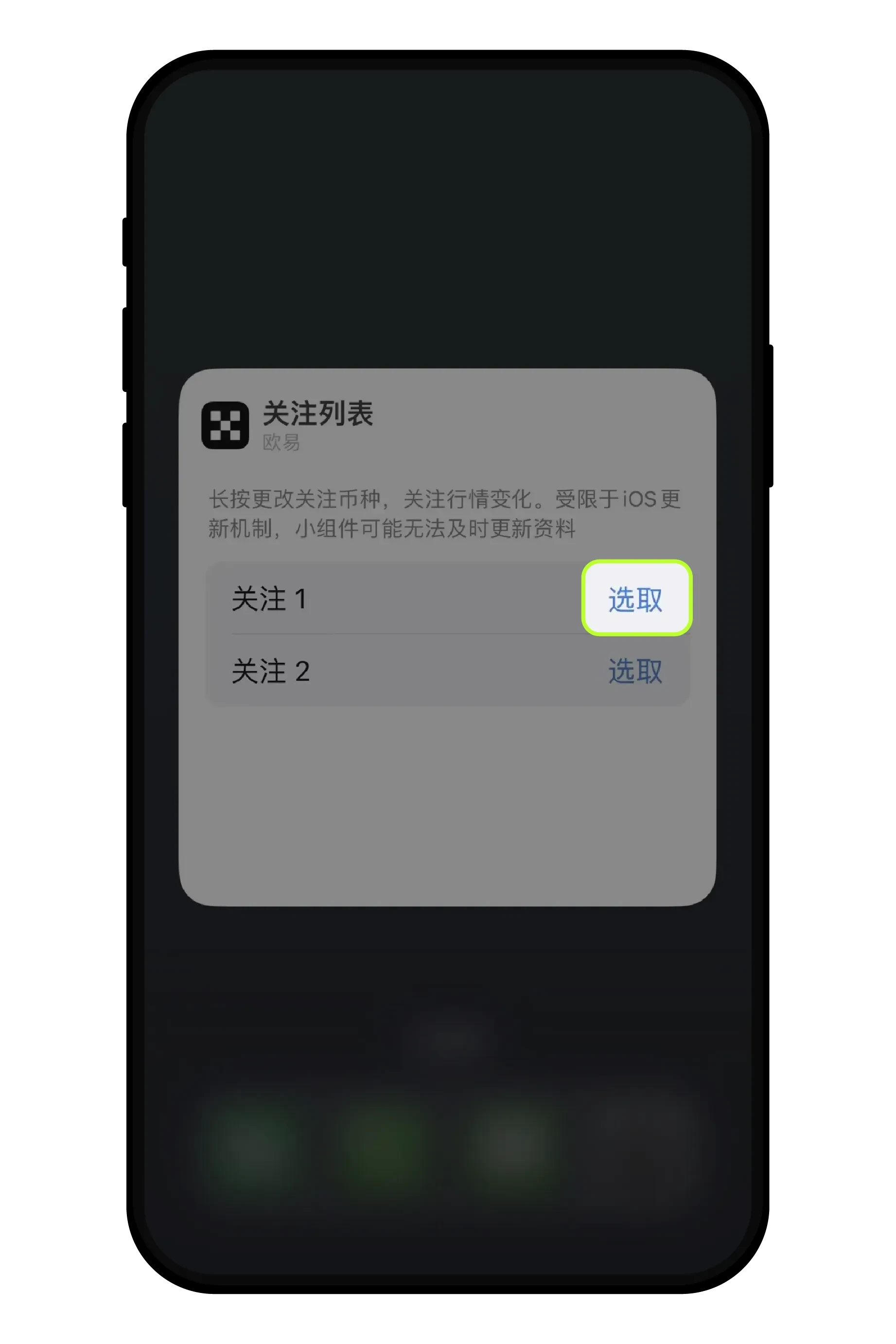 2、点击锁屏上的小组件区域,下滑选择“欧易”应用,左右滑动选择“关注现货”或“关注列表”等类型;