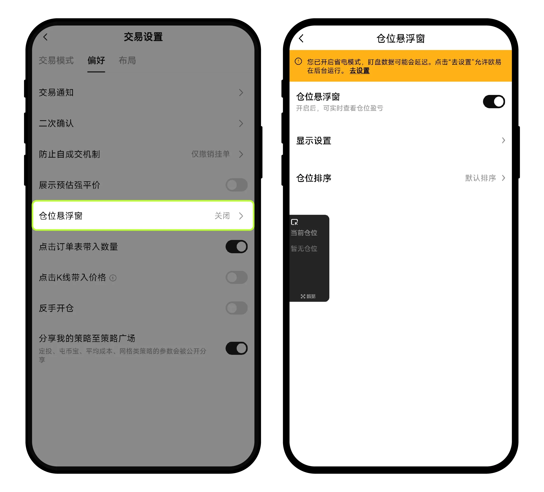 1、打开欧易App(官方注册 官方下载),进入任意交易对的K线图页面,点击【交易设置】→【偏好】→开启【仓位悬浮窗】;