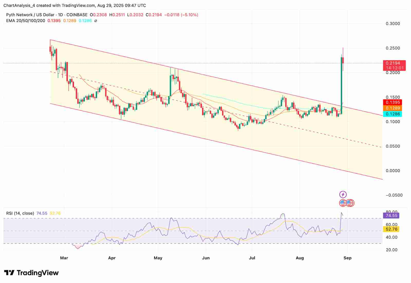 这一认可增强了投资者信心,并使 Pyth 成为实时去**化数据传输领域的领导者。随着 PYTH 交易价格接近 0.22 美元,并突破了持续一年的下行通道,随着该**进入新的增长周期,市场动能正在明显转向有利于买家。