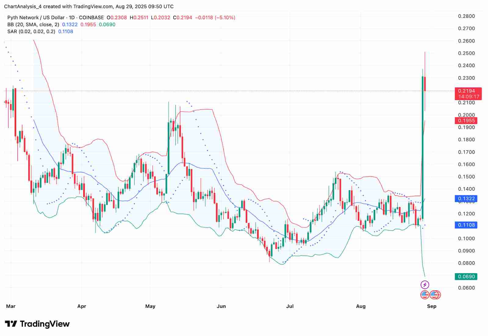 Pyth Network (PYTH) 创下了 2025 年最引人注目的涨势之一,单日涨幅近 70%,收复 0.20 美元区域。此次上涨的动力源于美国商务部一项具有里程碑意义的声明,该声明称官方经济数据将通过区块链预言机发布,而 Pyth 被指定为主要合作伙伴。