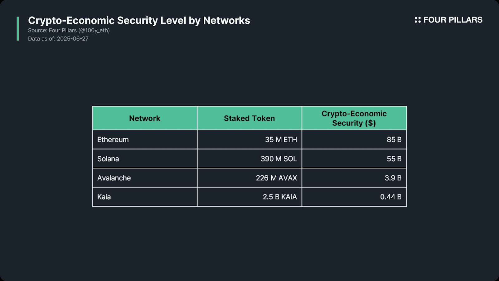 以太坊是安全性**的智能合约网路,截至2025 年6 月27 日,其加密经济安全规模约为850 亿美元,而Solana、Avalanche 和Kaia 的加密经济安全规模分别是为550 亿美元、39 亿美元和4.4 亿美元。以太坊拥有**的加密经济安全规模,所以最适合大规模稳定币流动性的部署。