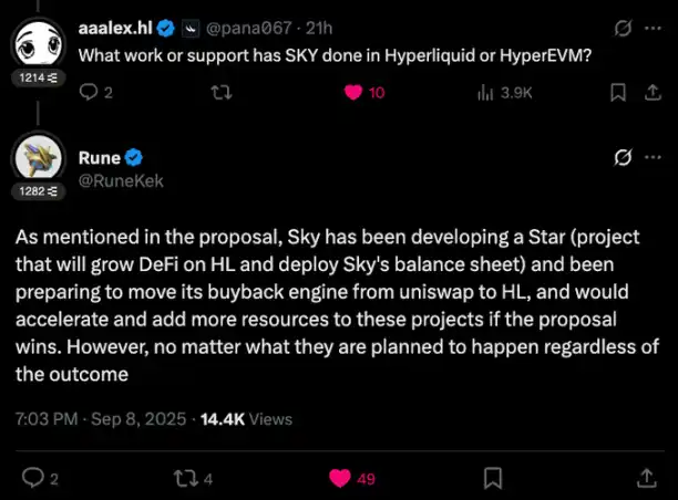 · 承诺投入 2500 万美元建立「Hyperliquid Genesis Star」**挖矿的 DeFi 孵化器,类似于 Spark(其 TVL 为 12 亿美元)。Sky 每年 2.5 亿 美元的利润回购可能会迁移到 Hyperliquid。这增加了流动性并为协议回购树立了标准。