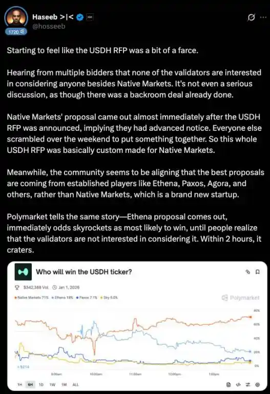 很多人把钱押在 Native 上,并且不断有消息传出,获胜者甚至在竞标开始前就已经决定了,如果你将 Native 成立的速度之快以及其提案与 agora 或 ethena 相比缺乏真正分量这些点联系起来,这确实有点道理。