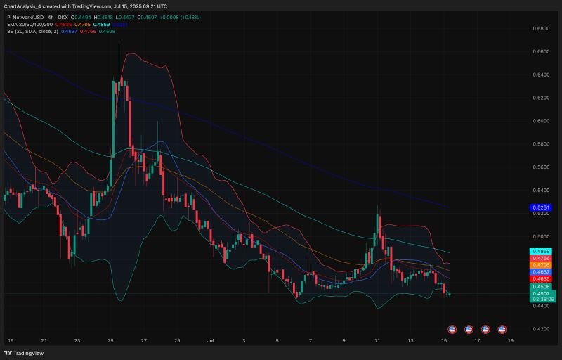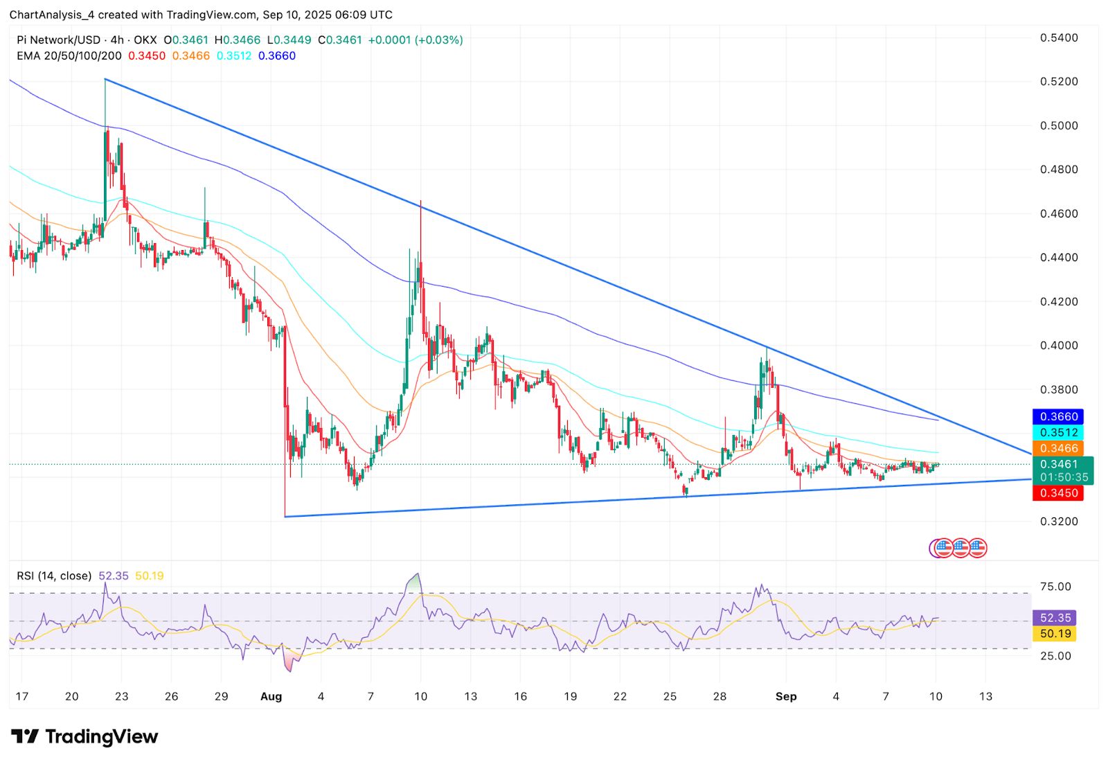 4小时图显示,PI在下行阻力位和0.345美元附近的上行基点之间收缩。短期EMA(20/50)已趋于平缓,反映出中性动能,而100EMA在0.351美元附近正成为关键支撑位。RSI位于52,表明市场情绪均衡,且存在向下或向下波动的空间。