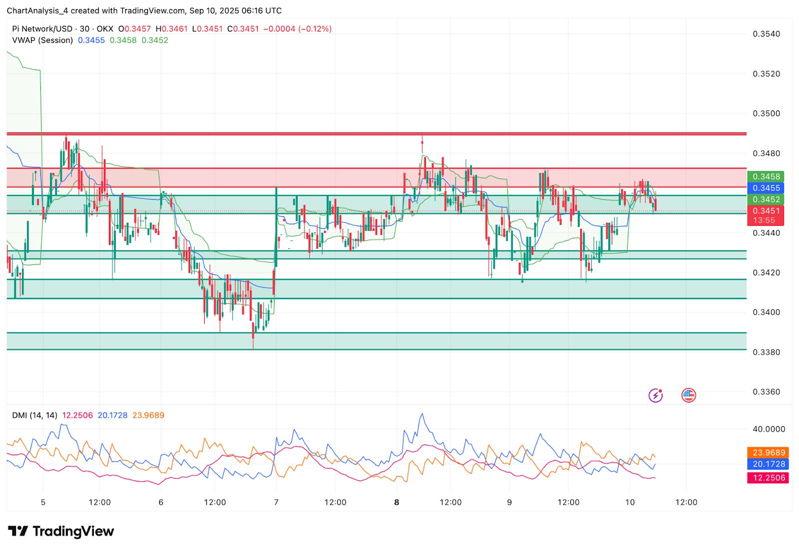 Pi 币今日价格在 0.345 美元附近交易,在下降三角形内紧密盘整。支撑位在 0.344 美元至 0.347 美元区间保持强劲,但阻力位仍在 0.352 美元和 0.368 美元之间。随着新协议升级和智能合约开发的逐步曝光,交易员们正在密切关注 Pi 能否突破这一压力位。