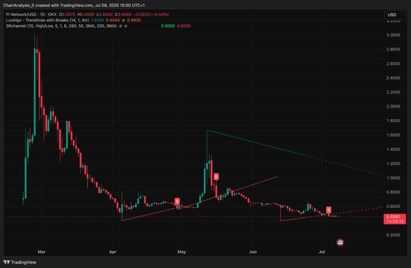 日线图显示,Pi 币仍处于长期下跌楔形中。若能**突破该形态,将标志着自 3 月份以来的**结构性转变,并可能开启 0.65 美元区间的上涨行情,这与追踪累积趋势的分析师的预测一致。