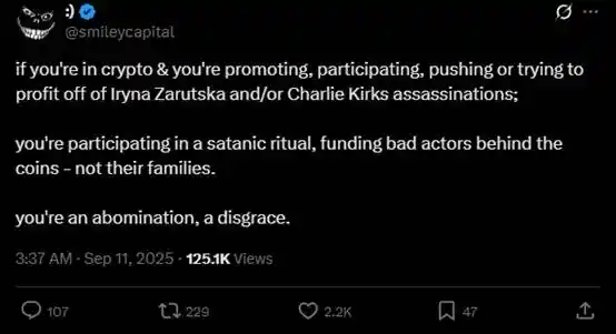 **,$CHARLIE 这个币在 Charlie Kirk 遇害的消息出现后立马被部署,不像 $PNUT 那样有一些时间缓冲让热度稍微降下来而显得炒作相关 meme 币是可以被接受的,这让 $CHARLIE 和疫情刚爆发时就炒作口罩价格的商家被大众指责一样,没有人会在那个时间点去考虑这是不是「合理的投机」,大家只会觉得「冷酷而无情」。