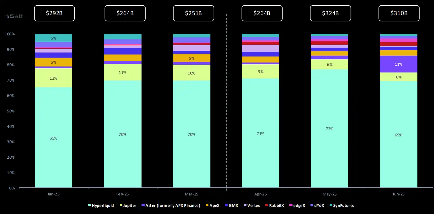 与之形成鲜明对比的是,曾经的龙头 dYdX 交易量却持续下滑,Q 2 月均交易额仅为 53 亿美元,不足年初的一半。这种此消彼长的格局,正凸显出 Aster 所代表的新一代 Perp DEX 正在获得市场的验证。