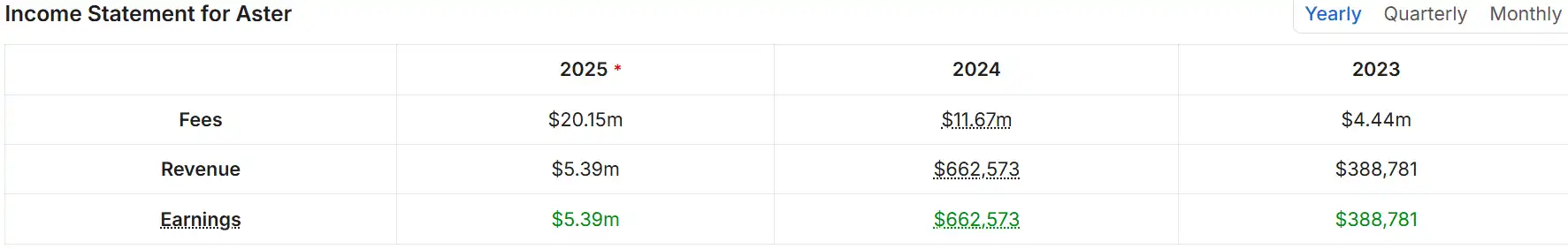 这一说法并非毫无缘由。defillama.com 数据显示,Aster 过去 30 天内合约交易量位居 BNB Chain 榜首,其链上锁仓总价值已超 18 亿美元,年化收入超 6000 万美元,年度收入增长率则接近 700%。这组数字背后,意味着 Aster 不仅跑通了产品体验与流动性护城河,更在用户粘性和收入模型上初步站稳脚跟,Aster 正快速上升为 BNB Chain 体系中的核心节点。