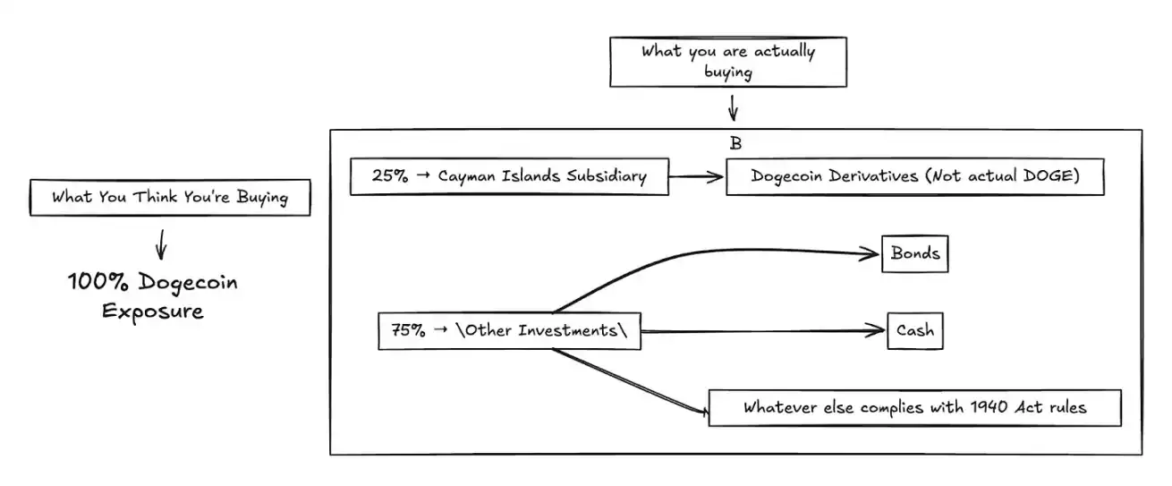 为满足分散投资要求,DOJE 无法直接持有狗狗币,转而通过开曼群岛子公司借助衍生品获取敞口,且相关持仓不得超过资产的 25%。这就造成了一个荒谬的结果:一只狗狗币 ETF,最多只能有 25% 的资产与狗狗币相关。