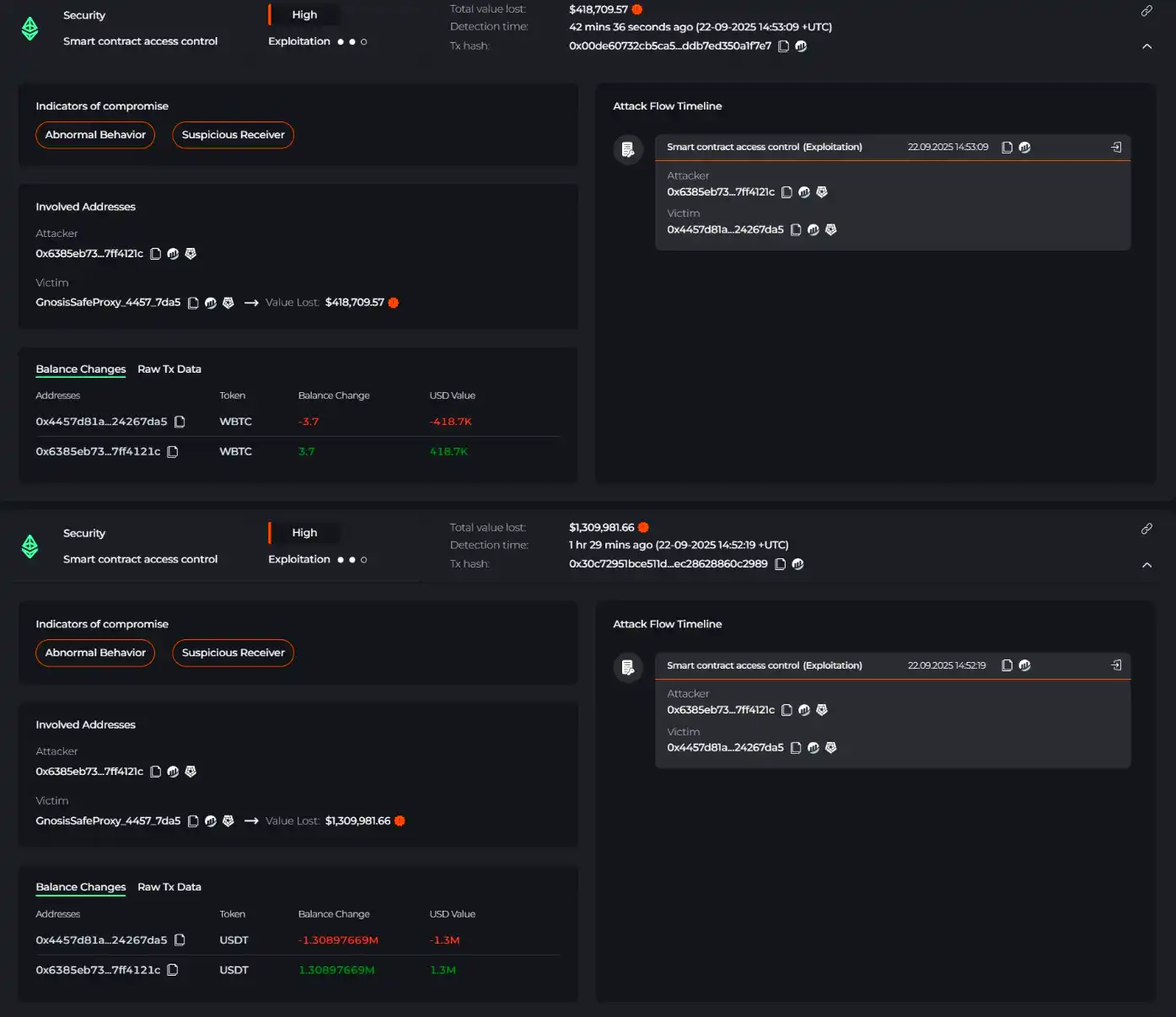 Cyvers 监测到与 UXLINK 相关的约 1130 万美元可疑交易:攻击地址通过 delegateCall 移除管理员权限、调用 addOwnerWithThreshold,转出 USDT 400 万、USDC 50 万、WBTC 3.7、ETH 25;以太坊侧 USDT/USDC 兑换为 DAI,Arbitrum 侧 USDT 兑为 ETH 并跨回以太坊。随后相关地址收取 1000 万枚 UXLINK(约 300 万美元)并开始兑换。