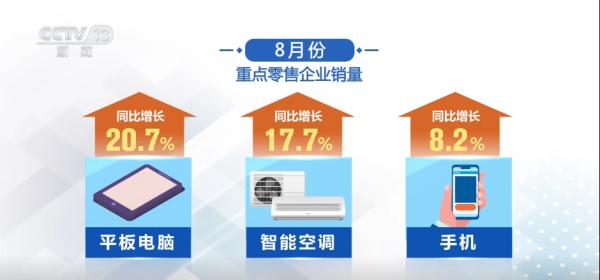 商品消费平稳增长。8月份,商品零售额同比增长3.6%,以旧换新相关商品销售保持较快增长。据商务部监测,8月份,**零售企业平板电脑、智能空调、手机销量同比分别增长20.7%、17.7%和8.2%。