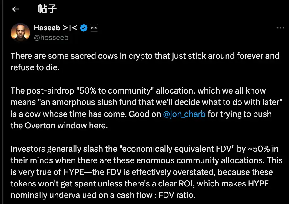 不是因为 HYPE 不好,而是因为账面数字太虚。Haseeb 认为,Jon 的提案是有推动作用的,把原本不能公开讨论的激进想法逐步变成可以接受的主流观点;我们需要质疑把**分配给「社区储备」这个加密行业的惯例。
