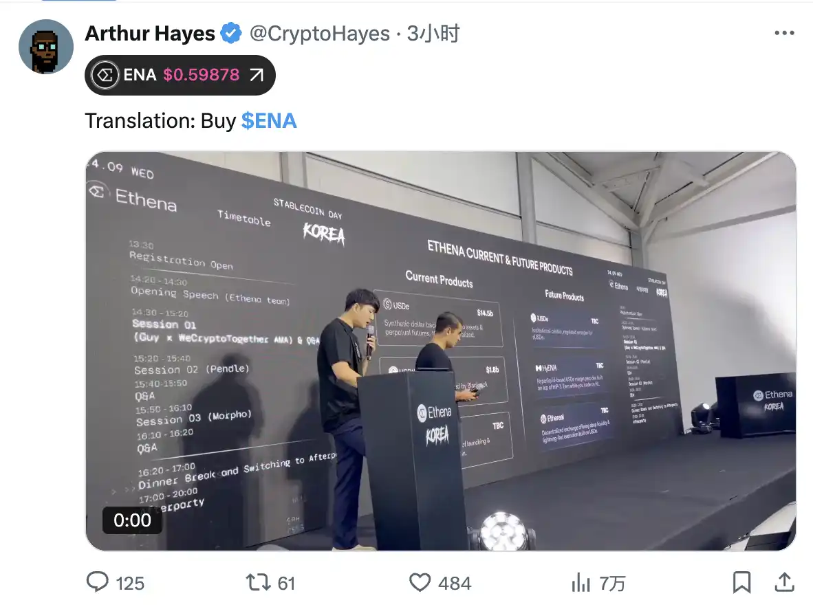 要说 Arthur Hayes 的经典逃顶案例,ENA **值得一提。