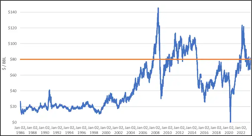 Tom 试图将 ETH 比作「数字石油」,大概想借此塑造一种不可或缺、稳定增长的资源叙事。但稍微熟悉商品市场的人都会知道,石油的价格经通胀调整后,过去一百多年基本都在一个宽幅区间内波动。它的上涨,往往是因为地缘冲突、供需错配等短期扰动,事后又会迅速回落。