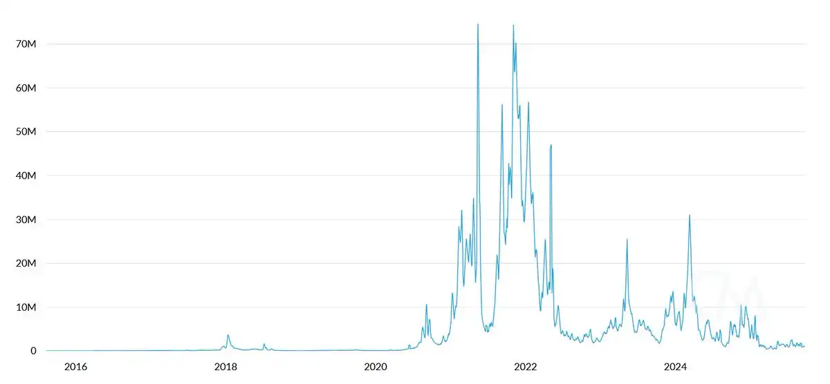 这个逻辑乍听之下颇为合理,但只要稍加查证,你会发现事实正好相反。尽管自 2020 年以来,稳定币交易量和**化资产规模**了上百倍,以太坊网络的交易手续费收入却几乎没有增长。原因也并不复杂:网络升级提高了处理效率,单笔交易成本下降;大量稳定币活动正流向其他公链。